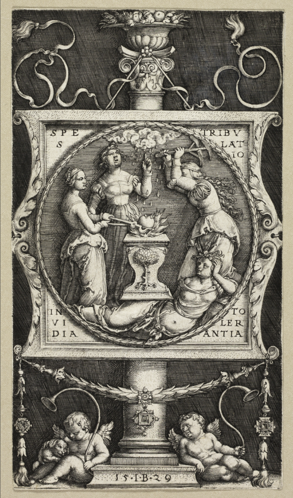 Willibald Pirckheimer, a leading scholar of the German Renaissance and a patron of classical learning, commissioned a plate that reflects both intellectual identity and personal heraldry. Rich with armorial imagery and allegorical ornament, the design binds the owner’s scholarly life to the physical volumes it marked. An inscription referencing possession “for himself and his friends” reinforces the humanist ideal of shared learning and cultivated fellowship.
